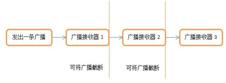 标准广播是一直完全异步执行的广播,广播发出后,所有的广播接收器几乎都会在同一时刻接收到这条广播消息,因此他们之间没有任何的先后顺序可言。这种广播效率比较高,也意味着它无法被截断