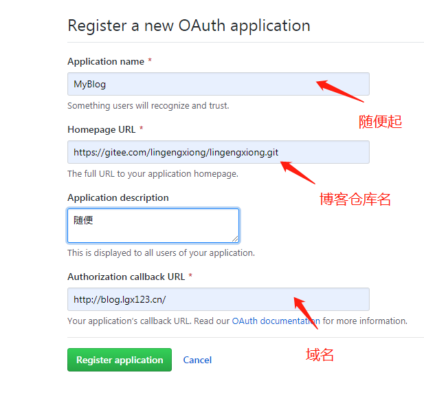 的域名就填新的,比如说我指向了域名http://blog.lgx123.cn/;否则也写仓库的名字就可以。